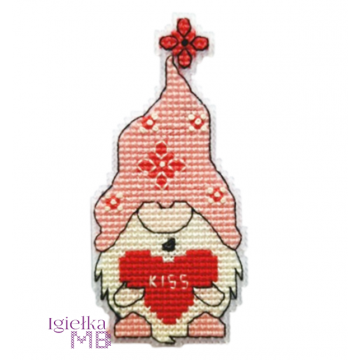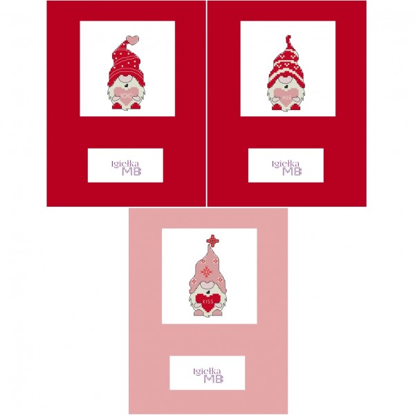 Cute pattern to cross-stitch with gnomes in love created for special designs for Valentine's Day. Delicate tones and romantic details show that the cross-stitch will be perfect for a greeting card. It will give a warm, handmade character. Simple and pleasurable patterns to stitch are a great choice for the beginner and advanced cross-stitch artists.