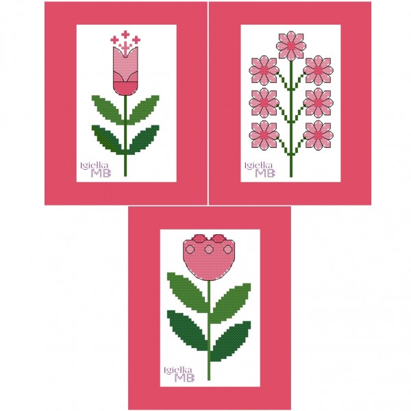 Set of three cross-stitch patterns featuring delicate floral motifs inspired by Scandinavian style and simplicity of form.