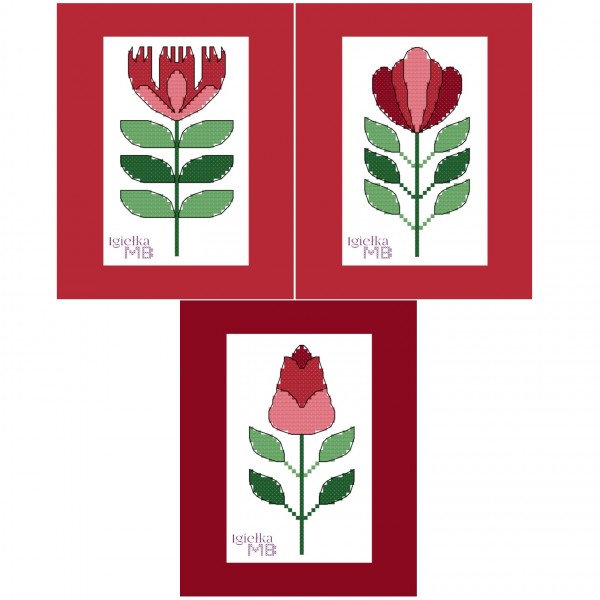 Set of three cross-stitch patterns featuring delicate floral motifs inspired by Scandinavian style and simplicity of form.