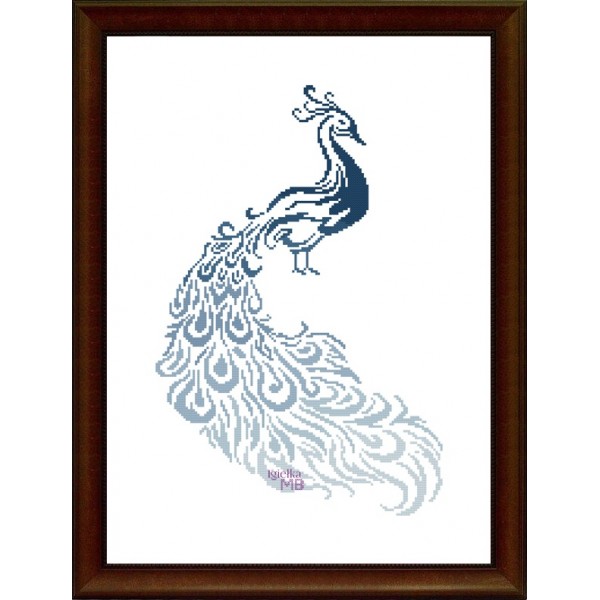 Elegant cross-stitch pattern featuring a stylized peacock in shades of blue. The subtle form and flowing lines of the tail give the design a light, decorative character, making it perfect as an eye-catching finished piece for modern or classic interiors. A great choice for those who appreciate artistic motifs, calm color palettes, and elegant cross-stitch designs.