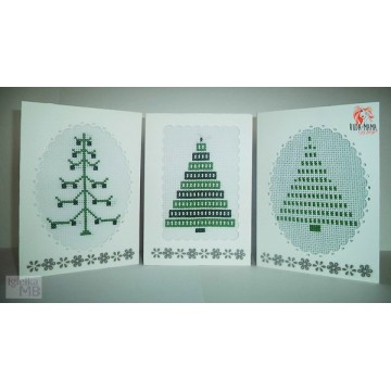 Cross-stitch pattern featuring three geometric Christmas trees in a minimalist style.
