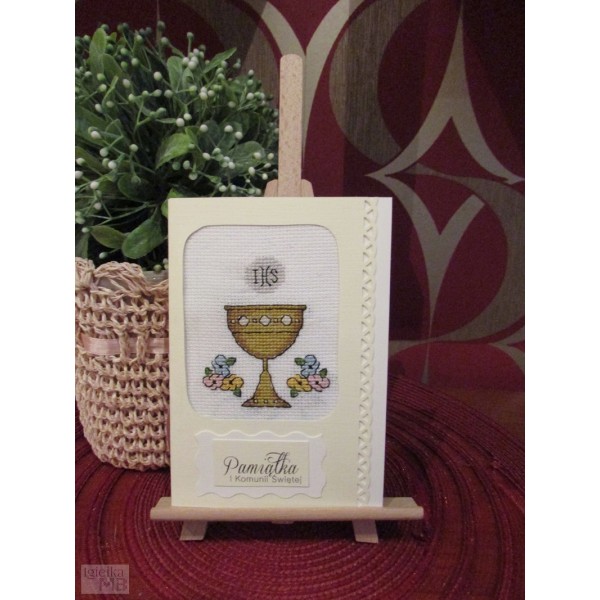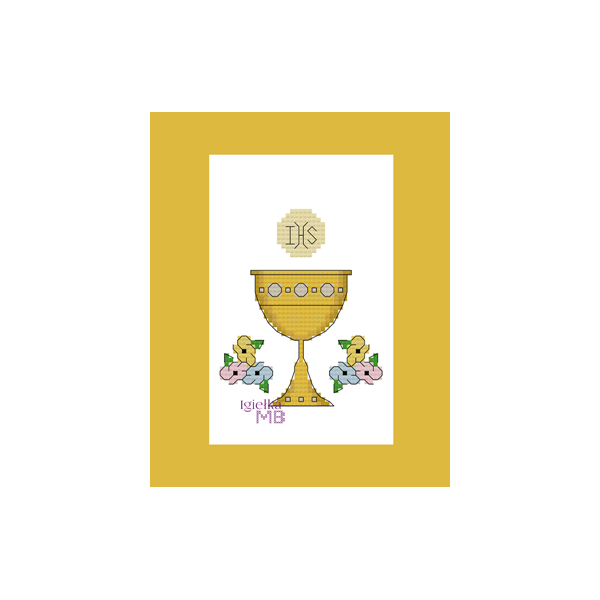 First Holy Communion cross-stitch pattern featuring a chalice, host, and Eucharistic symbols.