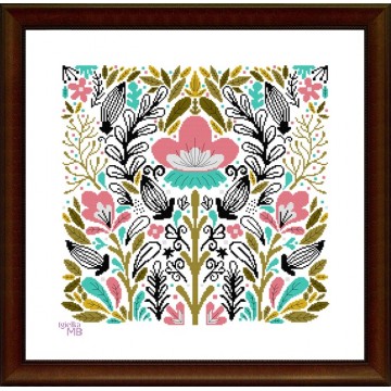 “Flower Fantasy” is a decorative cross-stitch pattern with a folk-inspired floral design. Soft pastel flowers combined with darker leaves create an eye-catching, balanced look.
