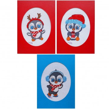 Zestaw wzorów do haftu krzyżykowego przedstawiający trzy urocze pingwinki w zimowej, świątecznej odsłonie. Każdy z bohaterów ma własny charakter i dodatek — czapkę, szalik lub zimowe nauszniki — dzięki czemu gotowe hafty tworzą radosną, ciepłą dekorację w bożonarodzeniowym klimacie.