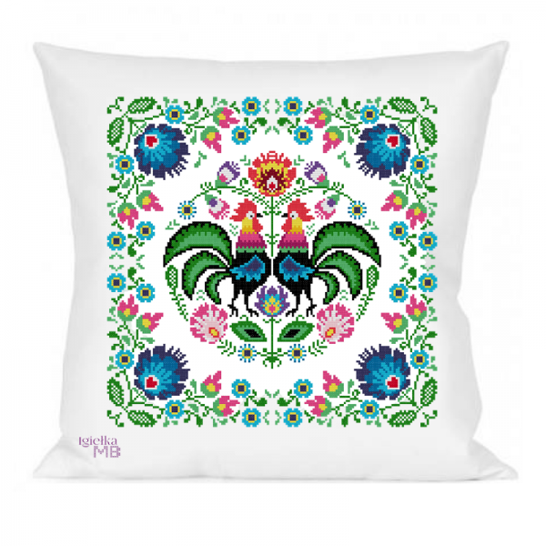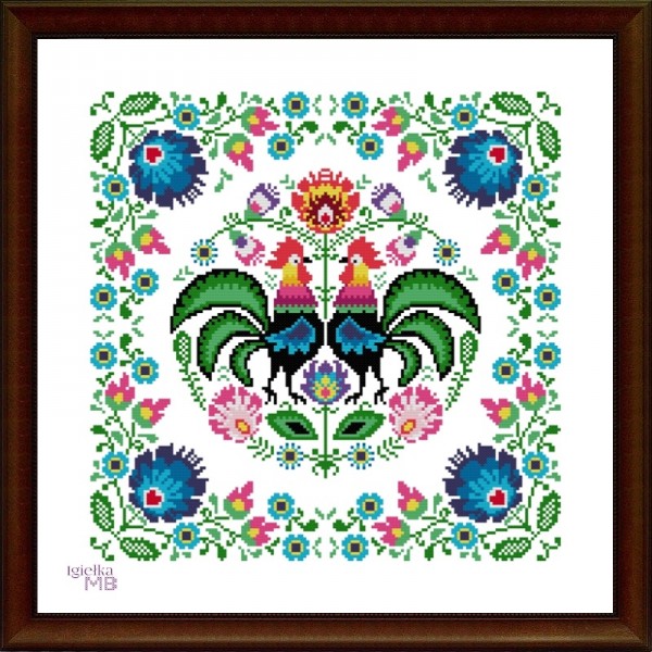Dekoracyjny wzór do haftu krzyżykowego z motywem łowickich kogutów, inspirowany polskim folklorem i tradycyjną sztuką ludową. Symetryczna kompozycja, bogata roślinna ornamentyka i żywa kolorystyka tworzą efektowny, a jednocześnie harmonijny projekt. Wzór doskonale sprawdzi się jako haftowany obraz, poduszka dekoracyjna lub serwetka, dodając wnętrzu wyrazistego, ludowego charakteru. Idealny wybór dla miłośników haftu krzyżykowego i folkowych motywów.