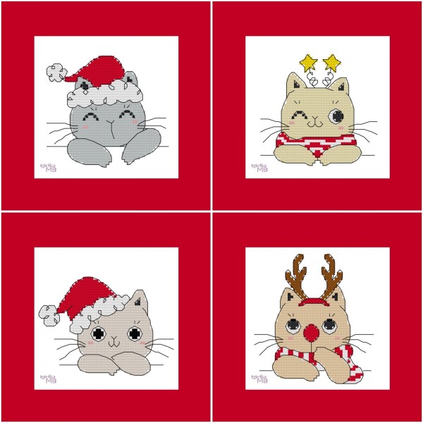 Komplet wzorów do haftu krzyżykowego z uroczymi kotami w świątecznych nakryciach głowy. Zestaw doskonale sprawdzi się jako zabawne kartki okolicznościowe lub drobne dekoracje, takie jak bombki na choinkę czy małe haftowane obrazki. Prosty i przyjemny wzór do wyszycia, idealny dla początkujących oraz osób, które chcą spróbować swoich sił z wyszywaniem konturów.