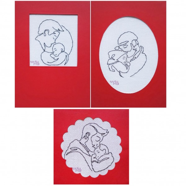 Haft wyszywany wyłącznie konturami tworzy wrażenie ulotności, a jednocześnie ukazuje to, co najważniejsze — miłość ojca do dziecka. Minimalistyczna forma pozwala skupić uwagę na emocjach i przekazie wzoru.