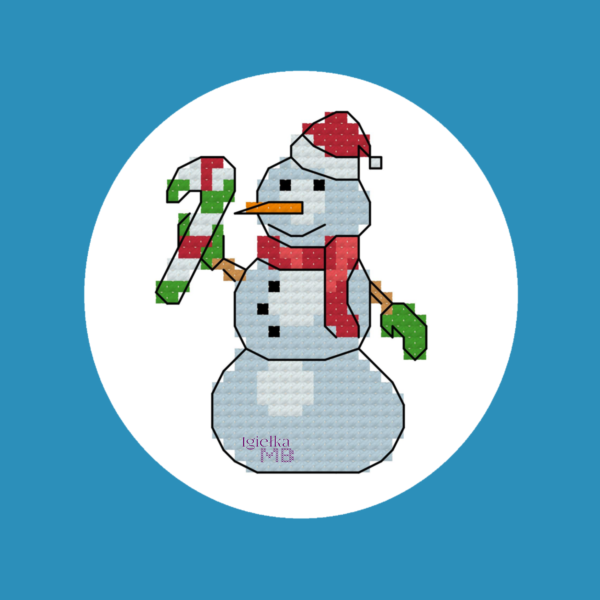 Wzór do haftu krzyżykowego przedstawiający sympatycznego bałwanka. Prezentowany projekt będzie ciekawą alternatywą na świąteczne kartki lub minimalistyczne zimowe dekoracje, takie jak zawieszki na choinkę czy małe obrazki. Wzór jest niewielki i szybki do opracowania, a zawarte w nim kontury pozwolą początkującym postawić pierwsze kroki w tej technice.